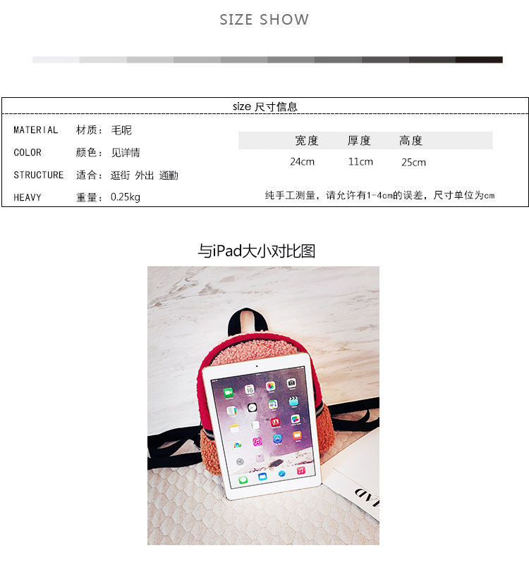 Size: small Is there a back cushion cotton: no Suitable for: youth Waterproof: Water repellent Gender: Female Texture: velvet Pick up parts type: soft handle Closed way: zipper Internal structure: zipper pocket phone bag document bag Popular elements: Hit color pattern: plain Bags hardness: soft Foldable: No Condition: New Applicable scene: leisure Style: Japan and South Korea Shape: vertical section square Shoulder strap style: double root Lining material: polyester-cotton