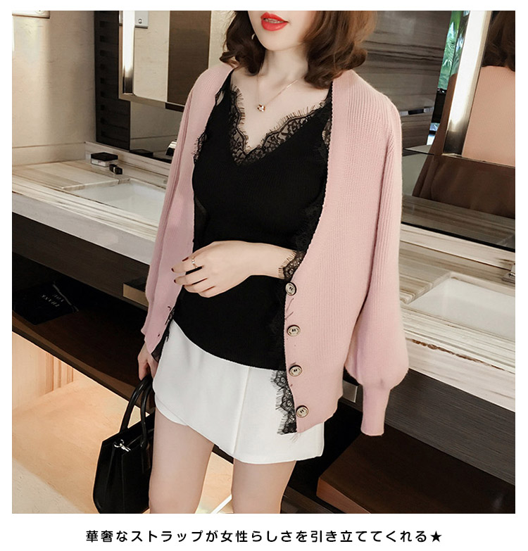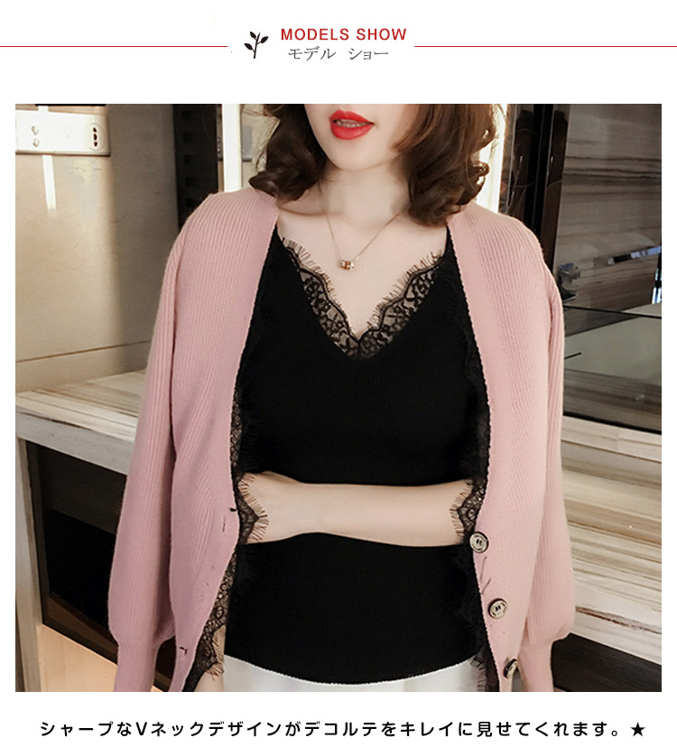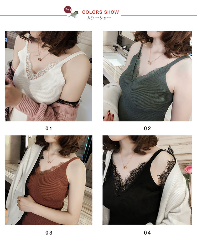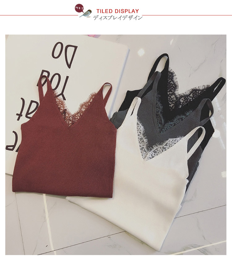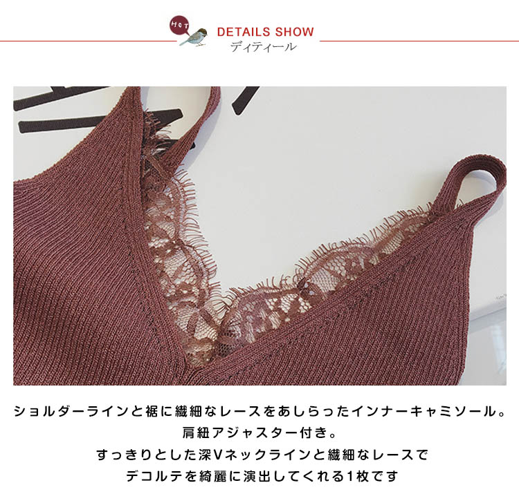 | スッキリ感のあるニットキャミソール★ シャープなVネックデザインがデコルテをキレイに見せてくれます。★ 華奢なストラップが女性らしさを引き立ててくれる★どんなボトムスとも合せやすく、コーディネートしやすいアイテム★ | |