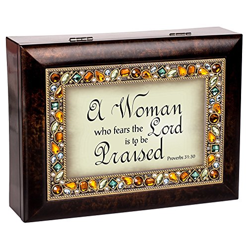 A Woman Who Fears the Lord is to be Praised Proverbs 31:30 Italian Style Burlwood Finish Decorative Jewel Lid Musical Music Jewelry Box Plays Amazing Grace