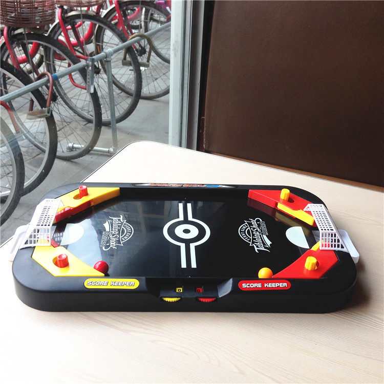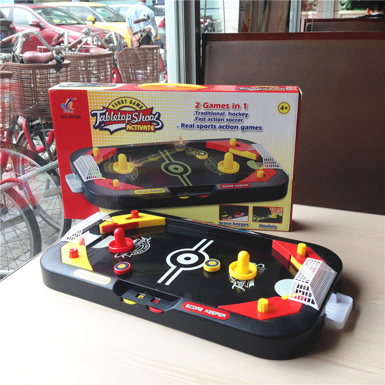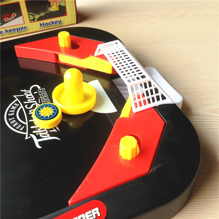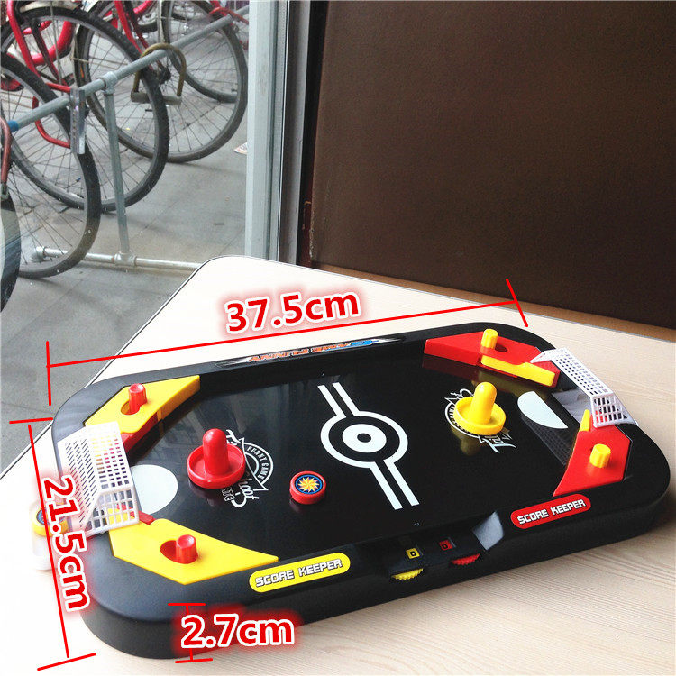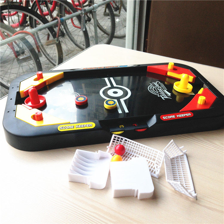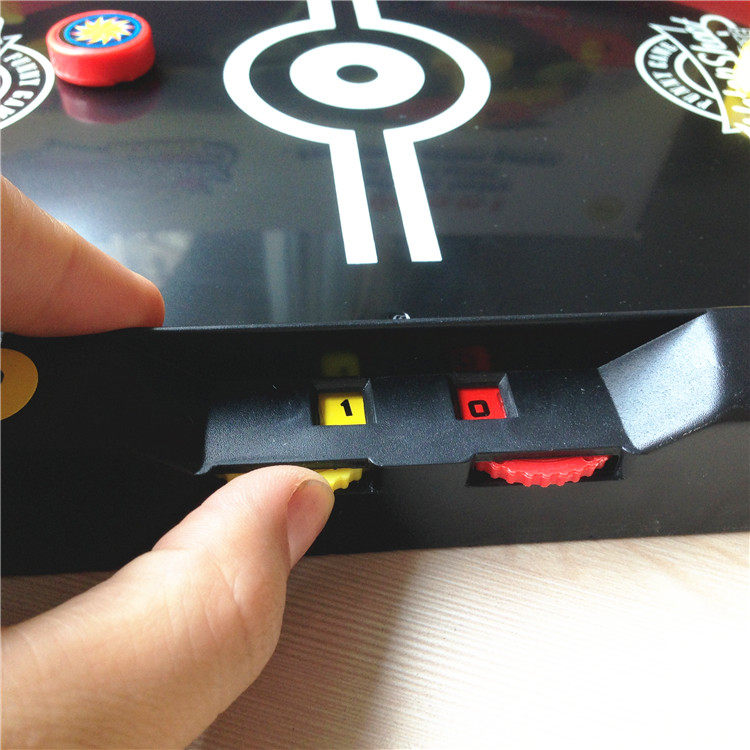 游戏2人,各拿一枚击打“棒”,就是那个底下带毛布的东东,击打冰球(带三个珠的圆饼)使之落入对方的球门,就得1分了,然后就可以调节计分盘,得分先到5,即为胜利!