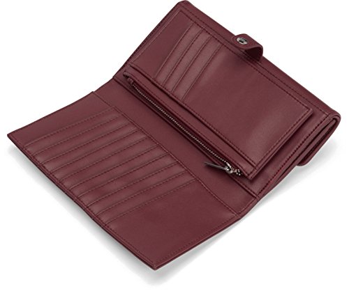 Bifold wallet with snap closure. Front flap coin pocket with snap closure. INTERIOR: 14 card slots and 2 bill compartments. Removable piece with 4 card slots with zipper coin pocket.