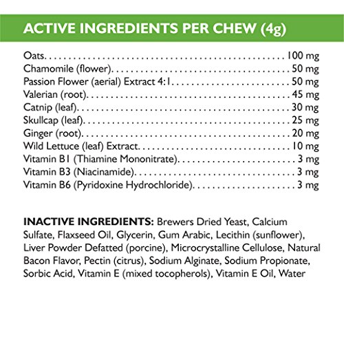 An all natural relaxer & anxiety aid for dogs, these bacon flavored soft chews offer support for any stressful situation. Holistic blend of B Vitamins, valerian, chamomile, catnip & more.