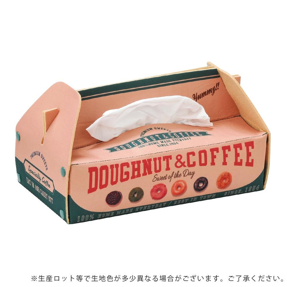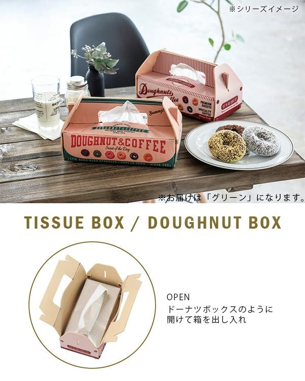 手に付いちゃったお菓子を拭くのにぴったり。 製造国:中国 素材・材質:ポリエステル、フェルト 商品サイズ:W26×L14×H14cm 仕様:組立式W23×L11.5×H5.5cmまでのティッシュ箱に対応します ※サプライヤー直送品 ご注文後3~4営業日後の出荷となります【商品名】セトクラフト ティッシュケース ドーナツボックス グリーン SF-4012-GR-150