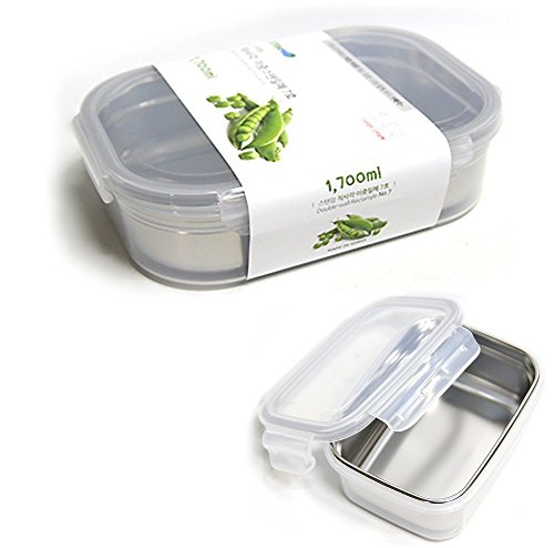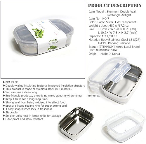 Stenmom Stainless steel Double-Wall Food Storage Containers Fresh Keeper Stackable Airtight Rectangle Box BPA Free 1.7L/58oz Composed of: 1 Container, 1 Lid, Total:2P