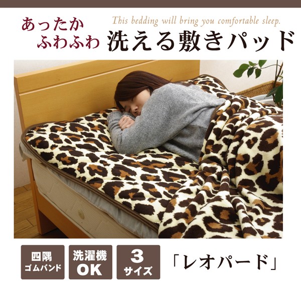 アニマル柄の敷きパッドです。表地には肌触りのよい、あったか素材の起毛生地を使用しています。中材には適度にわたを入れ、保温性とクッション性にもこだわりました。同柄の毛布も別途取り扱いがありますので、トータルでのコーディネートもお勧めです。ご家庭の洗濯機で洗えます(洗濯ネット使用)ので、いつでも清潔にご使用頂けます。