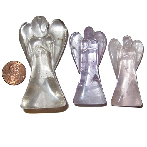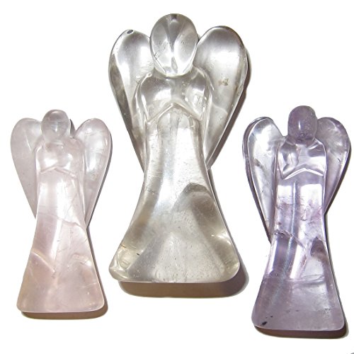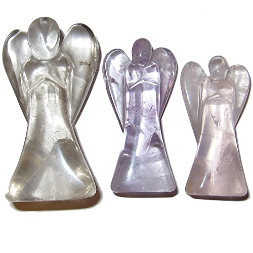 Your three heavenly angel figurines are carved from stunning Brazilian crystals. The largest is a clear smoky quartz, the second is a high quality clear amethyst, and the smallest is a pretty pale pink rose quartz. The guardian angel stands tall in prayer with wings out, and you can gaze through to see the inclusions of the stone. Receive the exact stone featured when ordering from Satin Crystals