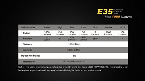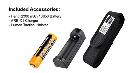 1000 lumens, 2016 Fenix E35 Ultimate Edition (E35UE) Compact Pocket LED Flashlight with a Fenix 2300mAh 18650 Battery, Fenix ARE-X1 USB Charger and Premium Lumen Tactical Holster