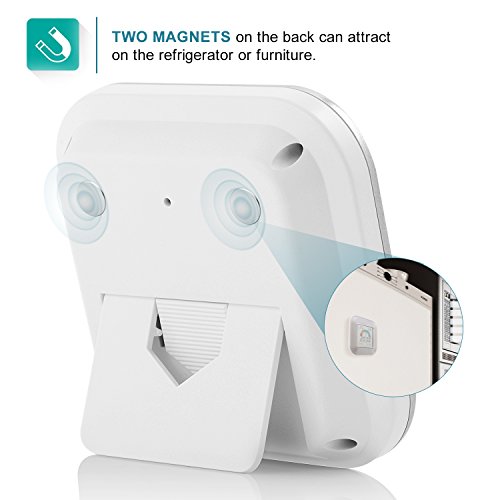 Place with Stand & Magnet – Two magnets on the back can attract on the refrigerator or furniture with magnet; or stand on the table with built-in supporting stand. 2*AAA batteries are included.