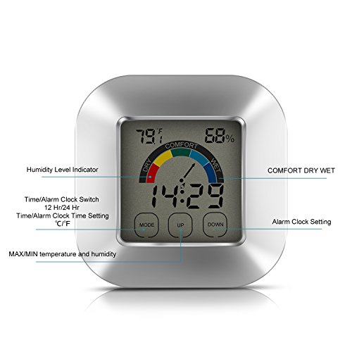 Must-have at Your Home- Multifunction household necessity embraces indoor temperature gauge and humidity monitor, time and alarm setting and humidity level icon display.