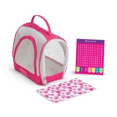 Pets can travel in style in this comfortable carrier! The set includes: A doll-sized pet kennel with a pretty paw-print pattern, shiny silvery accents, and a back pocket for accessories A fleece blanket to make a soft bed for a furry friend Decorative stickers for adding a pet's name