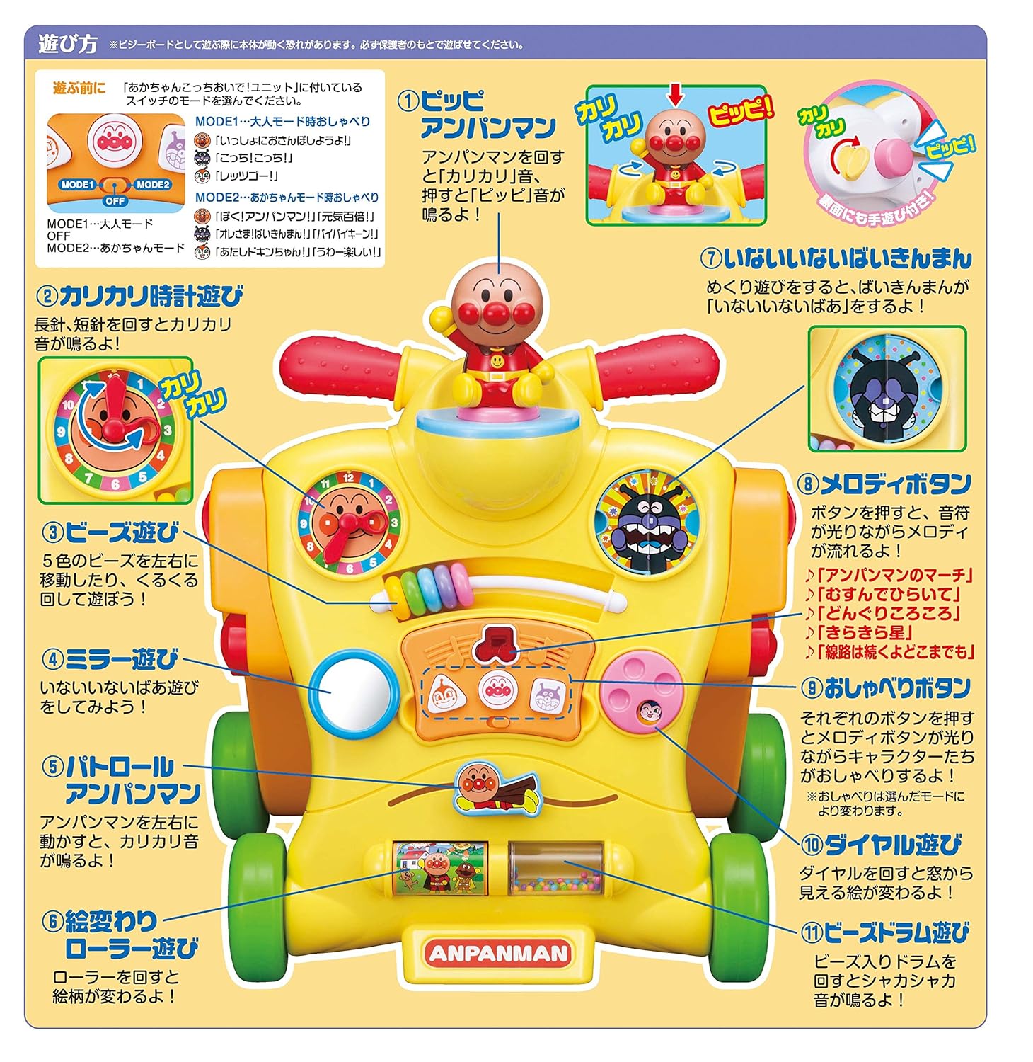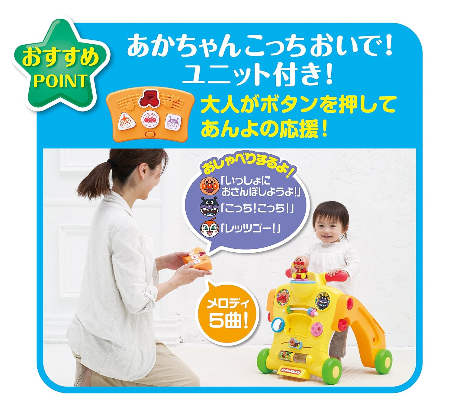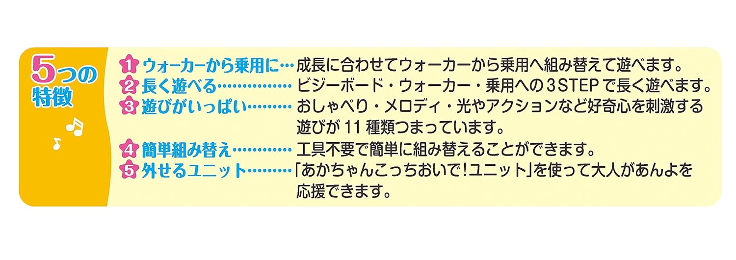 本体中央についている音声ユニットは取り外しが可能で、大人の方が離れた場所からメロディやおしゃべりのボタンを押して、お子様のあんよの応援が可能です。