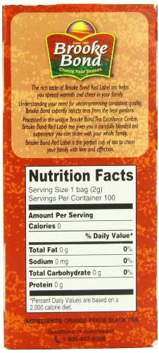 -. Binding : Grocery -. Brand : Brooke Bond -. Feature : A popular brand of assam tea from India / Convenient tea bags for easy preparation / Product of India -. Label : Brooke Bond -. Manufacturer : Brooke Bond -. NumberOfItems : 1 -. PackageQuantity : 1 -. ProductGroup : Grocery -. ProductTypeName : GROCERY -. Publisher : Brooke Bond -. Size : 100 -. Studio : Brooke Bond -. Title : Brooke Bond Red Label Tea Bag Orange Pekoe , 100 Count Boxes