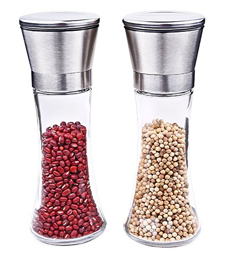 MuNiSa Stainless Steel Salt and Pepper Grinder,Manual Pepper Mill Shakers,Adjustable Ceramic Rotor,Glass Tall Body,Set of 2