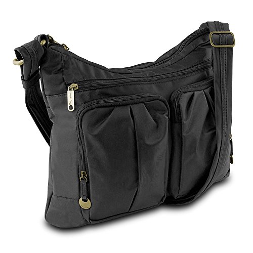 High level security and style. Travel safe and stylish with this adjustable crossbody bag. With RFID-shielding sleeves on the interior, your passport and credit cards are kept secure. The main exterior pockets lock for added protection. From Travelon. Not all cards contain RFID chips--this product only helps protect cards with RFID chips.Feature