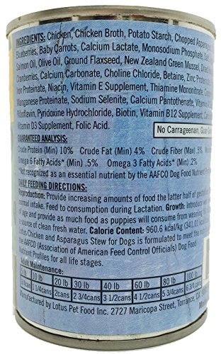 A dogs senses are like a superheros compared to ours. Thats why we make Lotus Wholesome Chicken & Asparagus Stew Canned Dog Food with the freshest, most natural ingredients that gives its wonderful aroma. USDA inspected lean meats, tender fruits and crisp vegetables, along with other delectable gifts from nature, like flaxseed, evening primrose oil and Norwegian kelp are simmered together, making for the great taste your dog will love.Feature