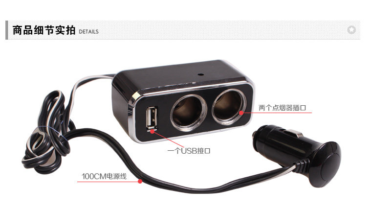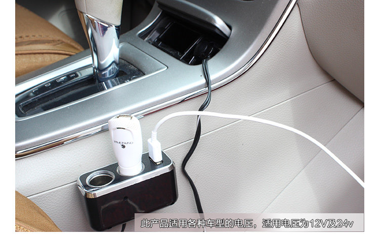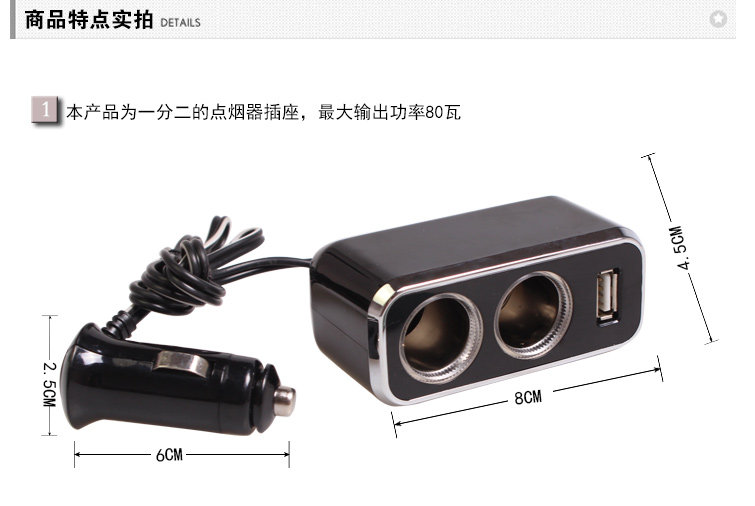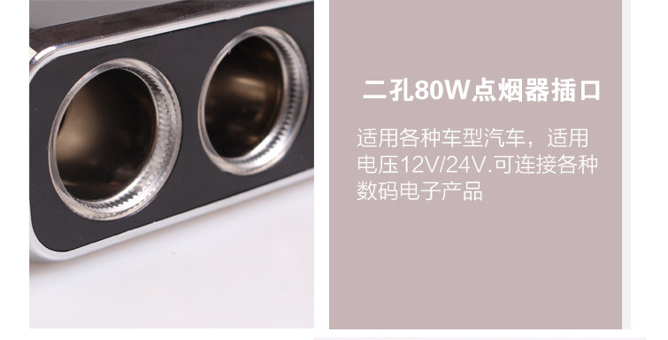 2. This product is a sub-two cigarette lighter socket, maximum output power of 80 watts, USB maximum output current of 0.8A, USB port for USB devices (MP3 / MP4, mobile phone, IPAD) and other charge. This product supports iphone charging