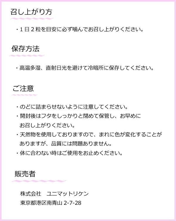 | 原材料 | ぶどう糖、麦芽糖、コラーゲンペプチド、マルトデキストリン、でん粉、豚プラセンタエキス、ビタミンC、結晶セルロース、香料、二酸化ケイ素、ステアリン酸カルシウム、クエン酸、甘味料(アスパルテーム・L-フェニルアラニン化合物)、ヒアルロン酸、(原材料の一部にゼラチン、豚肉を含む) |