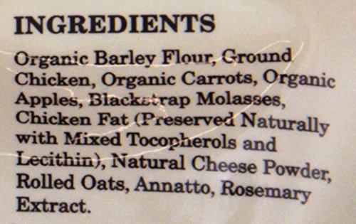 -. Feature : Made with human-grade ingredients, including certified-organic barley flour, ground chicken, carrots, apples, rolled oats, natural cheese powder, and more / Contains no wheat, soy, or corn / Fun, heart-shaped treats come in a convenient, resealable bag / Product of Canada