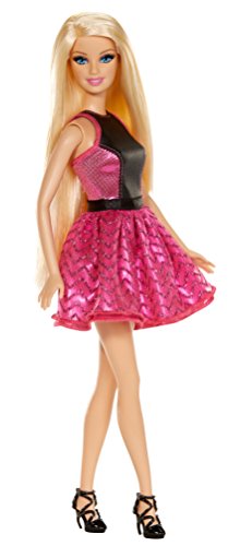 - Barbie doll wears an on-trend pink and black party dress with glittering detail and amazing black cutout shoes