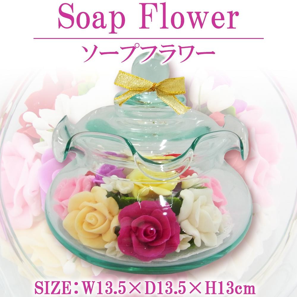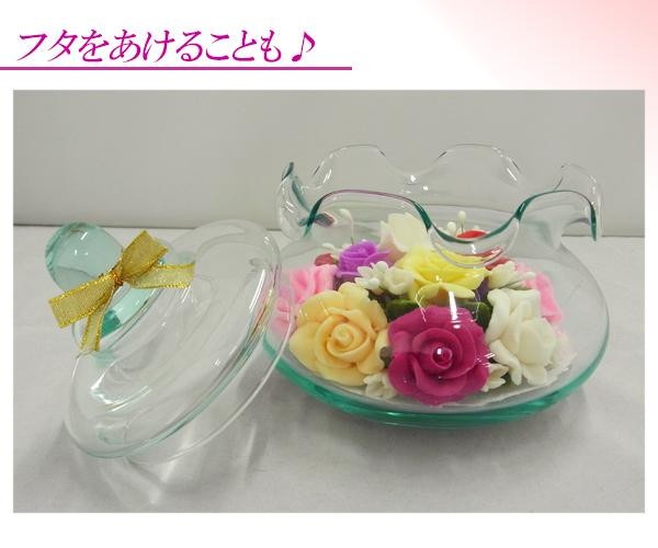 タイ王国にて、石けんを薄く加工し花びら1枚1枚を手作業で作りました。キャンディーボックスなどをモチーフにしたボトルガラスを使い、かわいらしい雰囲気を出しているのが特長。フタをあけると石けんの優しい香りが広がります♪ |