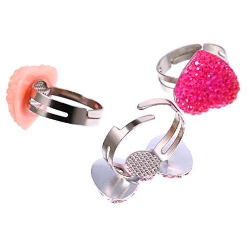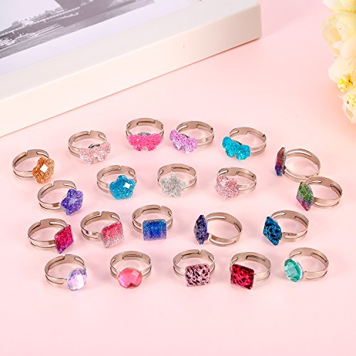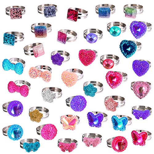 Princess jewelry rings set: Good for party, festival, daily life dress up, your girls will love wearing these shining rings on her fingers The rings are lovely and well made, different styles and colors to combine, good for party gift for your girl's little friends. Adjustable size: The metal part of the rings aren't connected at the bottom, so there's room to tighten or loosen each ring. And the unconnected bottom can be opened so these are not going to hurt kids' fingers. Many colors and shapes: Each order comes in a color assortment of different rings and fun shapes. Color has purple, pink, blue, and so on, shape has square, circle, heart, star, butterfly and more. Specification: Adjustable rings shape and color: as shown in the picture Ring circle diameter size: 1.6 cm/ 0.63 inch ( the ring circle is adjustable) Organza drawstring bag size: 7 x 9 cm/ 2.75 x 3.54 inch Organza drawstring bag color: yellow, green, pink, blue Package: 40 x Rings 4 x Organza drawstring bags Warm notice: Small items, please keep away from children under 3 years old. 0