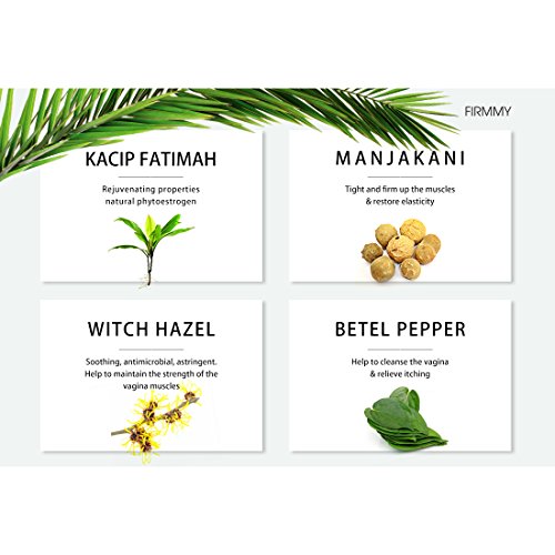 -. Feature : INGREDIENTS: Water (Reverse Osmosis), Vegetable Glycerin, Quercus Invectoria (Manjakani) Extract, Labisia Pumila (Kacip Fatimah) Extract, Psidium Guajava (Guava Leaf) Extract, Hamamelis Virginiana (Witch Hazel), Phenoxyethanol, Piper Betle (Betel Pepper) Extract, Citric Acid, Polysorbate 20, Fragrance / DIRECTION: Apply 1 full spray on your fingertip, insert and massage thoroughly into the vaginal walls. / DESCRIPTION: Firmmy introduces a revolutionary formula with exceptional tightening and nourishing qualities. This lightweight, non-oily dew features natural ingredients like Kacip Fatimah, Manjakani, Witch Hazel and Betel Pepper to supports the elasticity of your delicate area. / WARNING: USE AS DIRECTED. Do not use during menstruation. Do not use if you are pregnant. Consult your physician P.R.Ior to using if you have a medical condition. Keep out of reach of children. / • Benefits vaginal firmness and elasticity • Takes effect within 20 seconds • Natural Ingredients • Weight 0.3 FL.OZ each • Safe for Daily Use