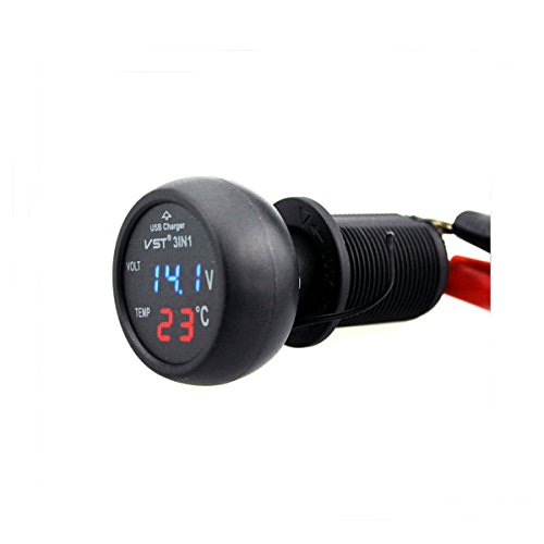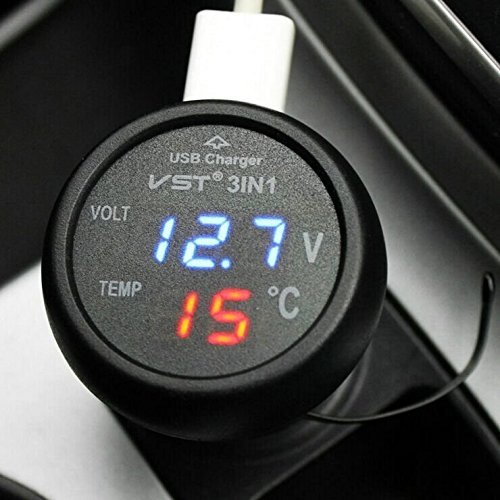 Yunanwa Universal Cigarette Lighter Car USB Port Cell-Phone Charger Digital LED Display Voltmeter Thermometer Auto Gauge 3in1 12 V 24 Volt Battery Voltage Tester Temperature Monitor Meter-MFN