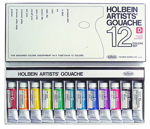 Holbein's Artists' Gouache is made with the finest, most saturated and lightfast pigments to create brilliant, opaque colors--with no opaquing agents! Made for the professional artist, the colors will not muddy when mixed and will not bleed or crack. Apply in thick, opaque layers to build up your surface, or add water for semi-transparency. This set includes 12 (15ml) tubes of: Cobalt Blue, Cyprus Green, Emerald Green, Geranium, Jet Black, Leaf Green, Permanent Yellow Orange, Permanent Yellow, Permanent White, Rose, Turquoise Blue and Violet.