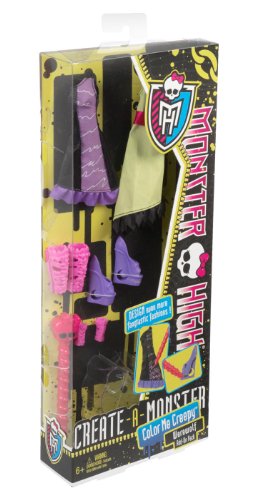 Monster High Create-A-Monster Color-Me-Creepy Add-On Accessory Collection: With Create-A-Monster add-on accessory pack, ghouls can decorate their own unique monsters, just like those at Monster High! Works with the Monster High Create-A-Monster Color-Me-Creepy Design Chamber and Color-Me-Creepy starter packs (sold separately). The Monster High Create-A-Monster Color-Me-Creepy Add-On Packs, with color-change transformational capabilities, expand the possibilities for unique, scary cool ghouls. Each Accessory pack includes two color-change fashions, color-change arm and leg jewelry, 1 pairs of shoes, a Skullette friction pen and a Skullette beaker. Each sold separately, collect them all!Feature