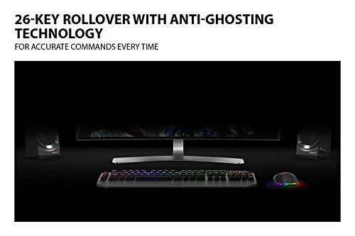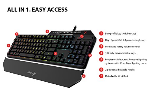 -. Feature : DURABLE PERFORMANCE - Pro-customized OMRON switches with double cross-point technology for over 70 million fail-safe keystrokes. / RESPONSIVE TACTILE FEEDBACK - Low 45g actuation force and short 1.5mm pre-travel distance offers rapid-fire input yet silent keystrokes. / 26-KEY ROLLOVER - Anti-ghosting technology and low-profile keycaps for accurate commands every time. / 109 CUSTOMIZABLE KEYS - With onboard media controls gives you an added advantage plus direct access to media playback handling. / CUSTOMIZABLE AURORA REACTIVE LIGHTING - Fully programmable keys with up to 16.8 million colors.