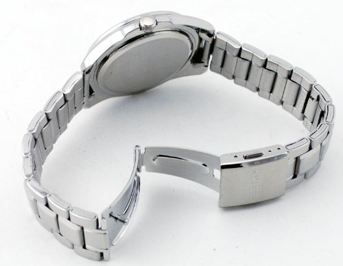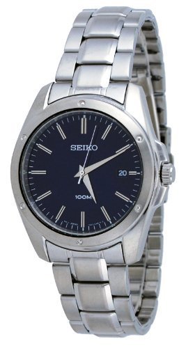 Casual watch, Japanese quartz movement, Polished silver-tone dauphine hands and sweep seconds, Applied black/polished silver-tone baton markers, White indices form surrounding minute track, Analog date aperture at three o'clock, Brushed marine blue dial, Brushed silver-tone stainless steel bracelet with polished detailing, adjustable links and push-button-clasp, Polished silver-tone stainless steel bezel with brushed top ring and six polished screws, Brushed/polished silver-tone stainless steel round case, Textured steel crown, Stainless steel caseback, Hardlex crystal, 100 meters/330 feet water resistantFeature