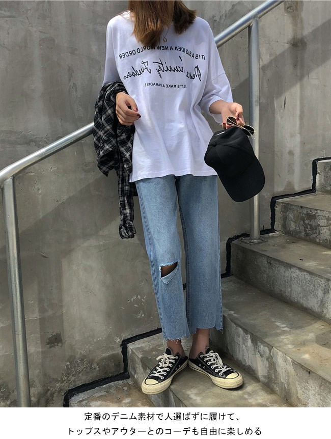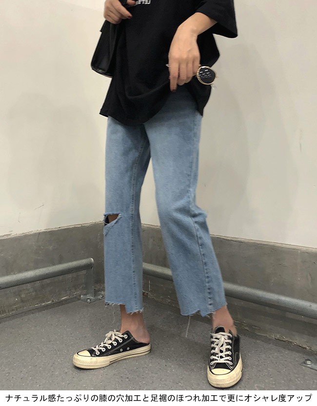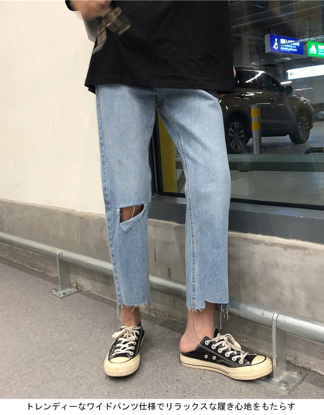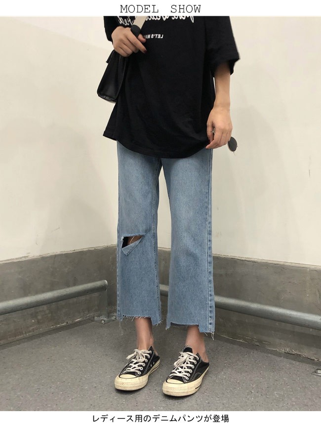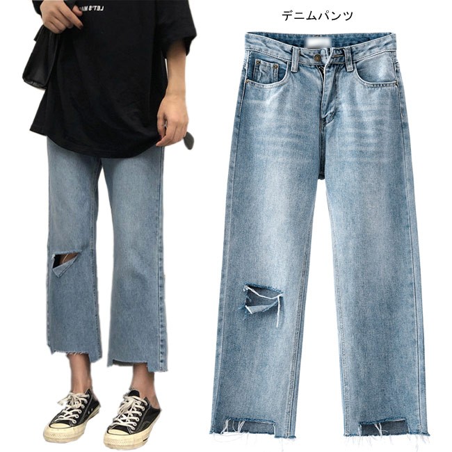 デニムパンツ レディース ワイドパンツ Gパン ダメージ加工 ガウチョパンツ 女性用 ボトムス ゆったり クロップドパンツ ジーンズレディース用のデニムパンツが登場トレンディーなワイドパンツ仕様でリラックスな履き心地をもたらすナチュラル感たっぷりの膝の穴加工と足裾のほつれ加工で更にオシャレ度アップ定番のデニム素材で人選ばずに履けて、トップスやアウターとのコーデも自由に楽しめるカラー:写真色素材 綿混紡サイズ(cm) S M LS 総丈82 ウエスト64 ヒップ92M 総丈83 ウエスト68 ヒップ96L 総丈83 ウエスト72 ヒップ100ご注意:※サイズは平置きサイズです。素人採寸ですので、若干の誤差がございます、ご了承ください。