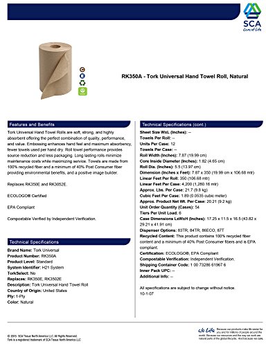 -. Title : Tork Universal RK350A Hardwound Paper Roll Towel, 1-Ply, 7.87" Width x 350' Length, Natural, Green Seal Certified (Case of 12 Rolls, 350 per Roll, 4,200 Feet)