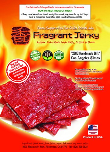 -. Feature : Fragrant Jerky uses 100% natural ingredients, no added preservatives, gluten free, GMO free. / Fragrant original flavor pork jerky is tender, salty-sweet taste, natural smoky BBQ flavor from the fire grill. Preservative-free jerky seasoned with 100% natural ingredients. Each piece is individually hand-grilled to perfection. As high protein, tender snacks or add to your favorite instant noodles, sandwiches, salads and more / Your order is fresh made-to-order, shipped the same day to assure finest quality, never prepackaged, never stored in a warehouse. / Fragrant's pork jerky is made from fresh USDA-inspected whole cuts of meat (ham meat). The extra lean ham meat cut just the right thickness and tenderized to spare you jaw the heavy lifting. Our products are made daily at our USDA-FSIS inspected facility in Los Angeles. / Singapore-style fire-grilled pork jerky (aka Bak Kwa) has been voted #1 pork jerky in the World. Fragrant Jerky's authentic Singapore-style pork jerky is three times Los Angeles Times food category winners and named "2013 Handmade Gift"
