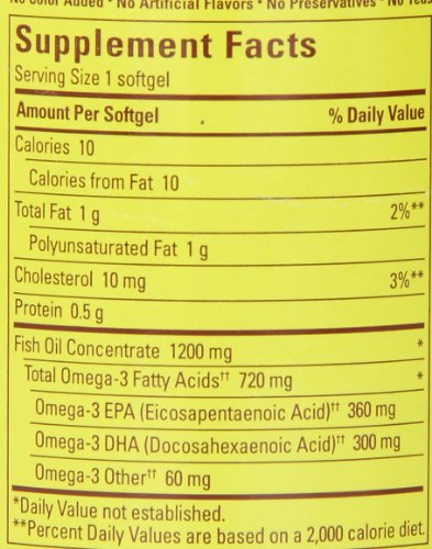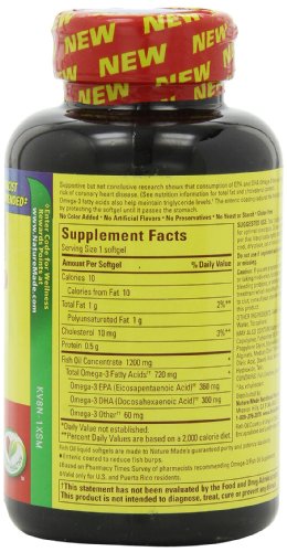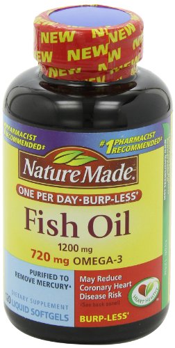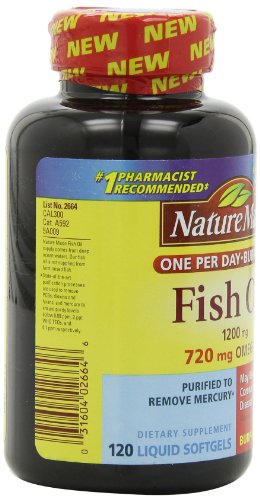 -. Binding : Health and Beauty -. Brand : Nature Made -. EAN : 0031604026646 -. Feature : Purified to remove mercury / Nature Made Fish Oil supply only comes from deep ocean waters, not farm raised fish / No artificial colors; No artificial flavors; No artificial preservatives -. IsAdultProduct : 0 -. Label : Nature Made -. Manufacturer : Nature Made -. Model : 2664 -. MPN : 2664 -. NumberOfItems : 1 -. PackageQuantity : 1 -. PartNumber : 2664 -. ProductGroup : Health and Beauty -. ProductTypeName : HEALTH_PERSONAL_CARE -. PublicationDate : 2011-03-25 -. Publisher : Nature Made -. Size : 120 -. Studio : Nature Made -. Title : Nature Made Fish Oil, 1200mg, 720 mg OMEGA-3, 120-Count -. UPC : 031604026646