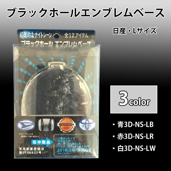 幻想的なブラックホールイルミネーション! 製造国:中国 素材・材質:樹脂 商品サイズ:約114×97mm 仕様:12V専用 付属品:エレクトロタップ1個 ※サプライヤー直送品  ご注文後3~4営業日後の出荷となります【商品名】ブラックホールエンブレムベース 日産 Lサイズ 白3D-NS-LW