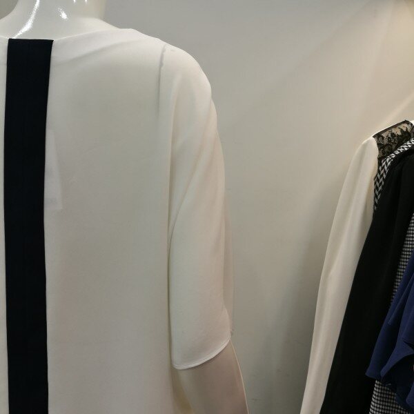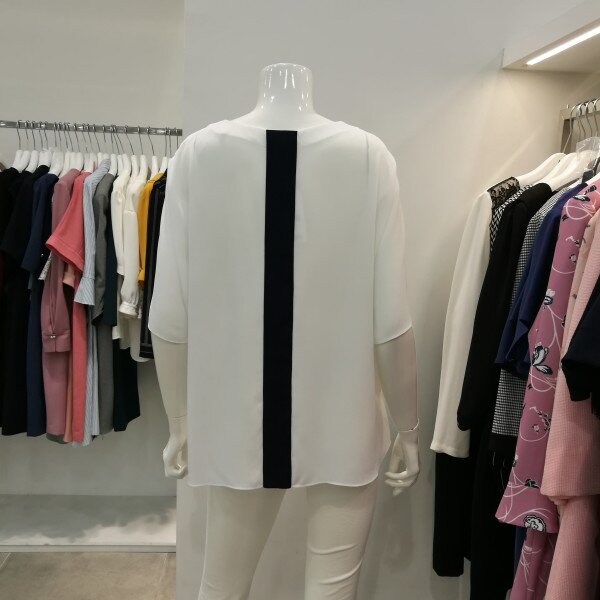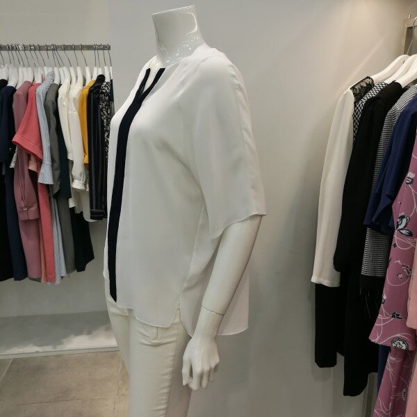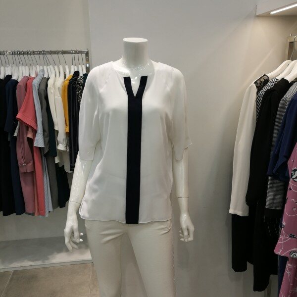 쉬폰블라우스로 시원하고 구김이 거의없으며 물세탁해서 바로 입을수 있는 스타일이며 배색이 되있어세련되었다.