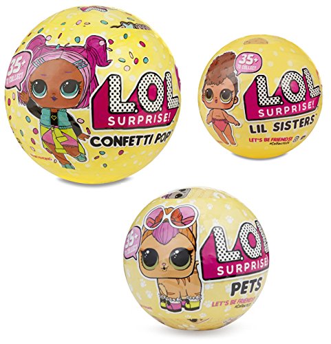 -. Feature : Includes (1) L.O.L. SurP.R.Ise! Confetti Pop Ball, (1) L.O.L. SurP.R.Ise! Lil Sister Series 3 Ball and (1) L.O.L. SurP.R.Ise! Pets Series 3 Ball / Confetti Pop Includes (1) Secret Message Sticker (2) Collectible Stickers (3) Bottle Charm (4) Shoes (5) Outfit (6) Accessory (7) Ring Tattoo for you (8) Confetti Pop (9) L.O.L. SurP.R.Ise! Doll with water surP.R.Ise / Lil Sister Includes 5 layers of surP.R.Ise inside (1) Secret message Sticker (2) Collectible sticker sheet, (3) Small Accessory, (4) Large Accessory (5) L.O.L. SurP.R.Ise! Lil Sisters Doll with water surP.R.Ise / Pets Include 7 layers of surP.R.Ise (1) Secret message Sticker (2) Collectible Stickers (3) Bottle (4) Shoes (5) Scooper (6) Accessory (7) Pet. Add water for another surP.R.Ise!