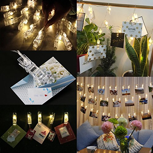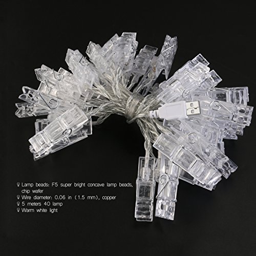 - This product included 40 clear photo clips,each clip contains an LED that emits warm white light,it looks beautiful when turn on in the night.The string lights 5 meters long.