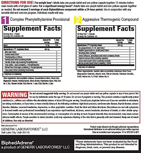 BiphedAdrene’s powerful, two-pronged attack on fat makes it unique and highly effective. However, this high-energy product is not for everyone because it is extremely potent and contains powerful xanthine (stimulant) compounds.* Nevertheless, if “ordinary” diet pills aren’t doing the job, BiphedAdrene could most certainly be your best bet! Ingredients Directions For weight loss, adults take 1 purple tablet and 1 yellow capsule 15 minutes before main meals with a full glass of water. For a significant energy boost, adults take 1 purple tablet and 1 yellow capsule as needed. Do not exceed 3 servings per day. Use in conjunction with any sensible diet and exercise program. Individual results will vary. Disclaimer *These statements have not been evaluated by the Food and Drug Administration. This product is not intended to diagnose, treat, cure, or prevent any disease. 0