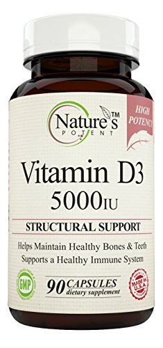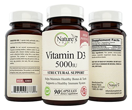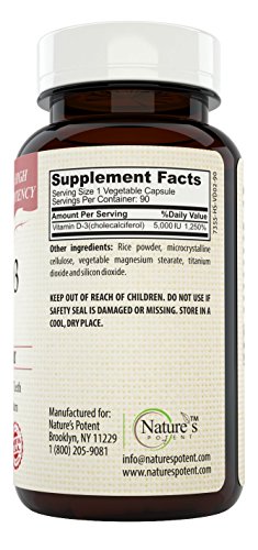 -. Feature : Helps Maintain Healthy Bones & Teeth / Supports a Healthy Immune System / Non-GMO High Potency Vitamin D-3 / Pharmaceutical Grade - Nature's Potent Vitamin D-3 5,000 Iu - Made to Nature's Potent guaranteed purity potency standards / 100% Safe - All our products Made in USA in FDA & GMP Certified Facilities - Third Party Tested to insure 100% Best Quality Products! 100% MONEY BACK GUARANTEE!