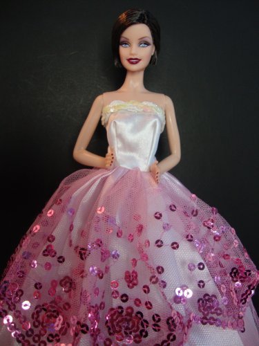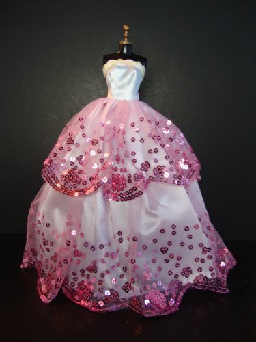 White Ball Gown with Pink Sequined Lace Details Made to Fit the Barbie Doll