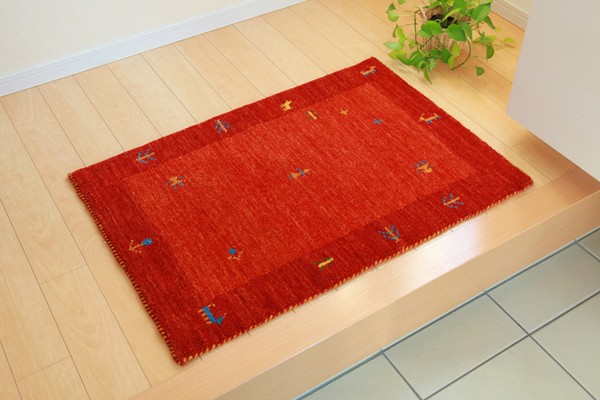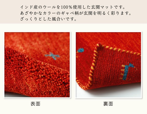 インドでつくられたウール100%の玄関マットです。品質を証明する『ウールマーク』が付いた商品です。ざっくりとした素材感があり、肌触りはふかふかとしています。シンプルなギャベ柄とあたたかな色合いで玄関のアクセントとしても最適です。