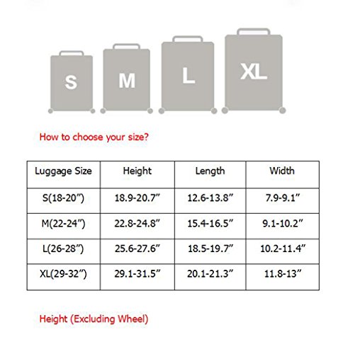 Product Description Size: 4 sizes available to fit almost any luggage. S: fit 18-20 inch luggage, M: fit 22-24 inch luggage, L: fit 26-28 inch luggage, XL: fit 29-32 inch luggage. Please measure your luggage size carefully ! And campare with the size chart in the picture. Tips:There 're invisible zipper in both of the cover side, so no matter the direction of the side gap in right or left , it 's just ok. Package Content: 1 x Suitcase Cover ONLY 0