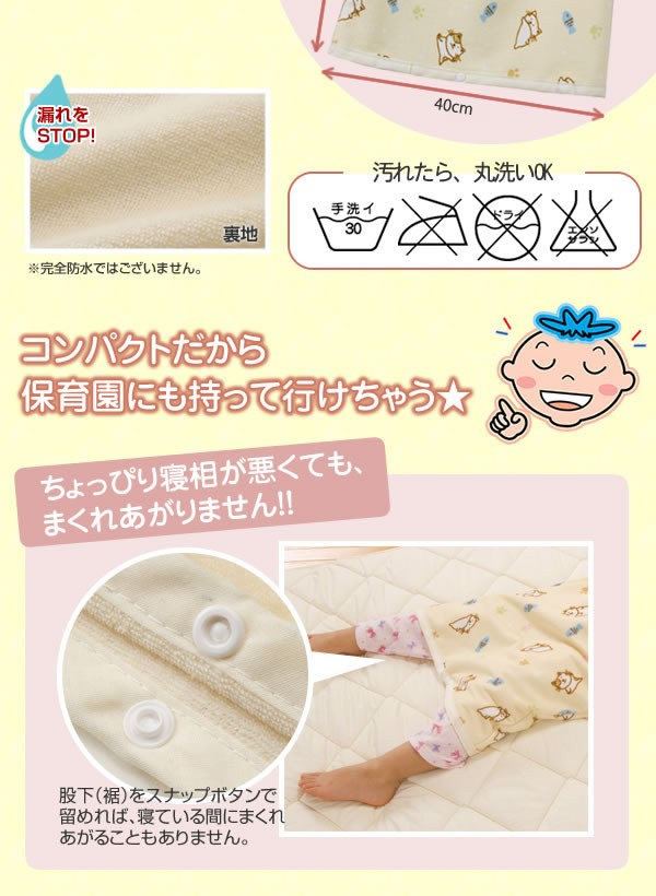 履かせるだけでおねしょの漏れをガード★うっかりおねしょをしてもおふとんを汚しません。まくれあがりを防止するスナップボタン付で寝相が悪くても安心です。洗い替え用に複数買いがオススメ!