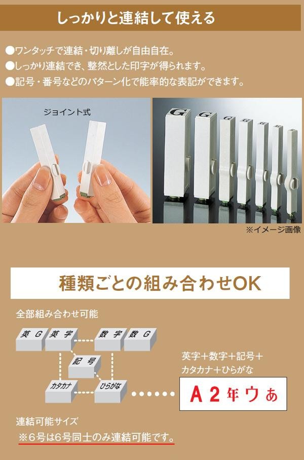 軽く押さえるだけで連結でき、引っ張るだけで簡単に切り離せるジョイント式スタンプです。多様な表記が可能。整理しやすい便利なケース入り。