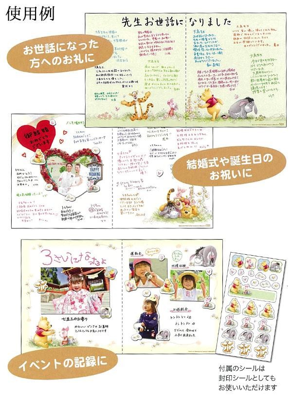 プーさんがデザインされた優しい色合いの寄せ書きブック。写真や付属のシールを使って自由にアレンジ!!見開き3ページあるのでたっぷり書き込めます。絵本のような堅い表紙がついているので、保管にも便利です♪