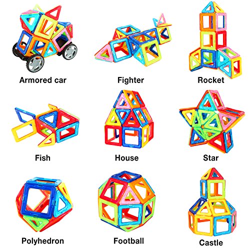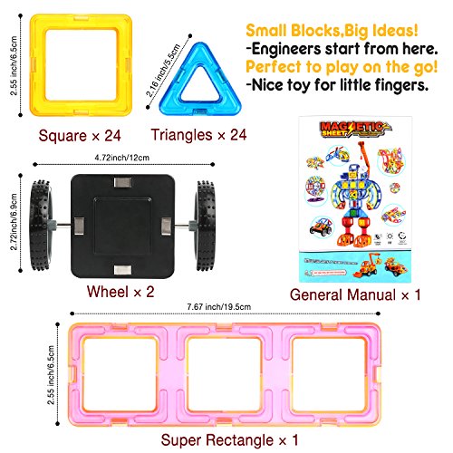 -. Feature : 【Totally 51 Piece】: 51 pcs standard size magnetic building set, includes 24 squares, 24 equilateral triangles, 1 Rectangles, 2 pairs of wheels for early learning and brain development, great educational toy in assorted rainbow colors for endless fun and building. / 【Safe & Power magnet】: Only non-toxic ABS plastic food grade material is used; Smooth edge of each tile will never hurt baby's little hands. / 【Develop Skills】: Could develop children's fine motor development, cognitive development of color, teamwork ability, artistic cognitive, sensory, cognitive ability, practical ability, imagination and creativity. / 【More Than Fun For Kids】: With power magnetic tiles and vibrant rainbow colors, can easy connect to DIY building models as children like. More accessories, more fun. / 【Perfect Gift For Any Occasion】: Perfect for use at Day Care Centers and in Occupational Therapy Settings. Appeals to boys and girls of all ages and makes an excellent birthday gift for kids as it is a best magnetic and educational toy in market.