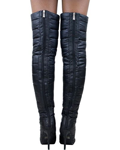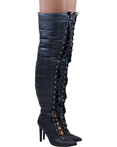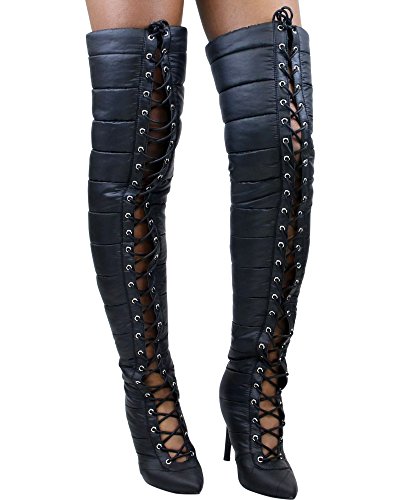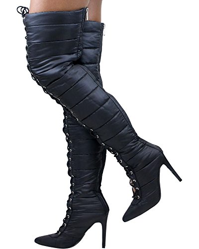 Cape Robbin Gigi-23 Black Lace Up Thigh High Heel Pointed Over Knee Puffer Nylon Boot