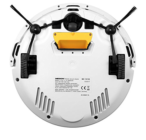 Lieferumfang: Medion Staubsauger Roboter MD 16192, Fernbedienung, Ladestation, Lichtschranke (Virtuelle Wand), 1 Filter und 1 Ersatzfilter, 2 Seitenbursten und 2 Ersatzseitenbursten, 1 Reinigungsburste, 2x AA Batterien fur die Fernbedienung, 2x AAA Batterien fur die virtuelle Wand - Hohe nur 8 cm, Durchmesser Ø 30 cm, Gewicht: ca. 1,9 kg - Hersteller Garantie: 24 Monate